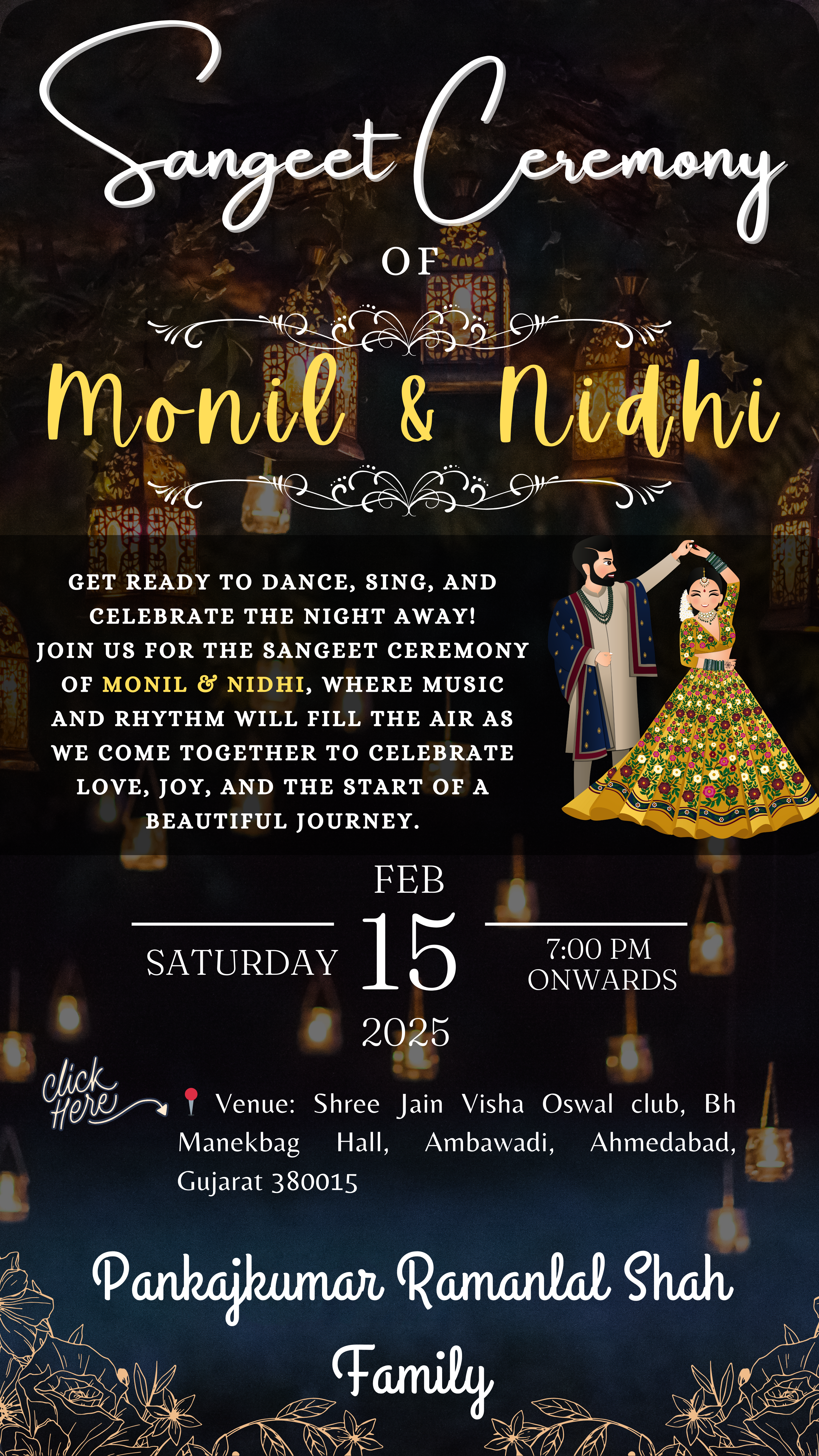 Let the rhythm take over as we celebrate the joyous union of Monil & Nidhi with a night full of music, dance, and unforgettable memories!